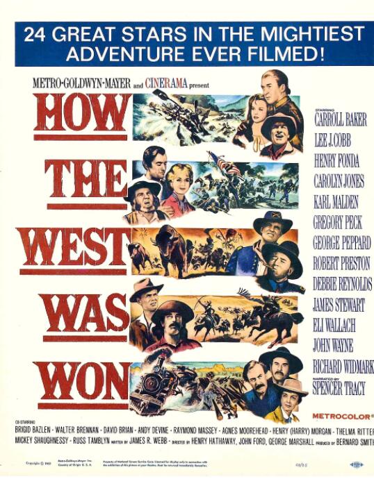 简介:西部开拓史(How the West Was Won)是一部1962年的史诗型式西部片。时间设定为1839年至1889年。情节是拓荒者普莱史考特一家人四代的故事西部开拓史(How the West Was Won)是一部1962年的史诗型式西部片。时间设定为1839年至1889年。情节是拓荒者普莱史考特一家人四代的故事,旁及各相关人事物;从中呈现半个世纪的美国西部历史。此片气势雄浑壮阔,编剧、取景、摄影、配乐、音效、导演、演员 阵容,各方面俱臻上乘水平。全片包括5个部分:《急流》、《平原》、《非法之徒》,由亨利·海瑟威执导;《南北战争》由约翰·福特导演;《铁路》由乔治·马歇尔执导。故事讲述一家三代在各种时代背景下的艰难曲折,通过这个家庭从19世纪早期到1880年代半个世纪的迁徙经历,描述美国西部历史。他们从纽约出发,经历了内战,淘金热,路遇印第安人和西南部的流放者,经历各种艰难险阻,终于到达西部,并联合其他开拓者在平原上修建了铁路,把法律与正义也带到了边疆。详情