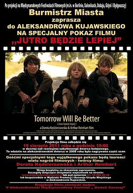 简介: 三个无家可归的男孩,两个兄弟,他们是好朋友,住在俄罗斯的铁路车站。有一天,他们决定去在寻找一个更美好的明天。他们想越过边界偷偷进入波兰,寻找他们想要的一切, 三个无家可归的男孩,两个兄弟,他们是好朋友,住在俄罗斯的铁路车站。有一天,他们决定去在寻找一个更美好的明天。他们想越过边界偷偷进入波兰,寻找他们想要的一切,可是孩子们还没有家庭,朋友,幸福... ... Dorota Kędzierzawska's film tells the story of three homeless Russian boys who travel to Poland for a better life, with the hope that l ife is different and better somewhere else. The boys wanted to change something in their life.…详情